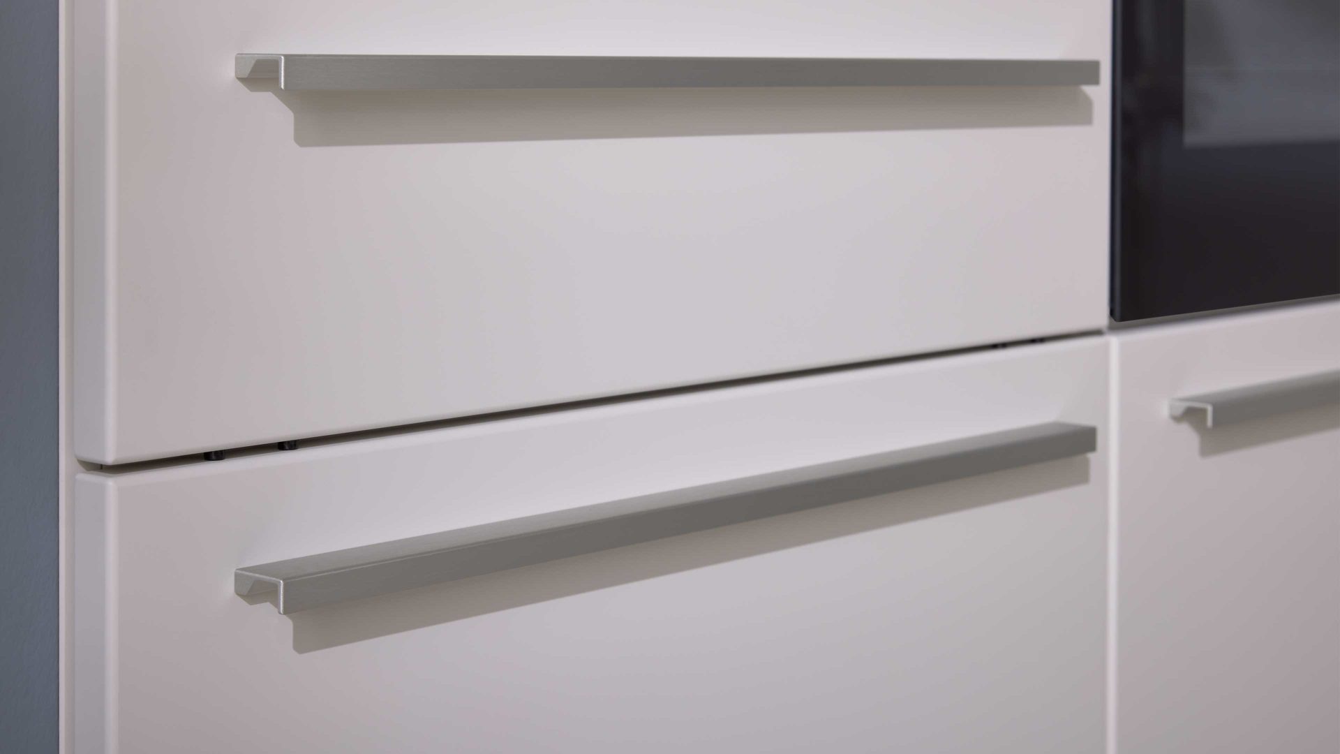 Die WERT KÜCHE® Bionda begeistert mit einer besonders ruhigen, eleganten Ausstrahlung. Satinierte muschelweiße Fronten, kombiniert mit passenden Korpussen und edelstahlfarbenen Griffstangen, sorgen für ein harmonisches Gesamtbild. Die extra dünne Arbeitsplatte in Marmor Scuro-Nachbildung setzt dabei einen stilvollen Akzent und verleiht der Küche eine moderne, hochwertige Note.
