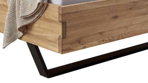 geöltes Wildeichenholz, kombiniert mit einer schwarzen Lisene (Einlage) und schwarzen Metallkufen