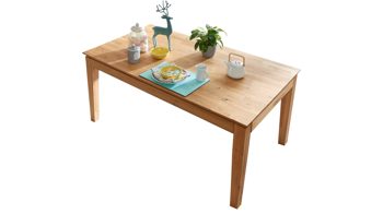 die Tischplatte mit Lamellenoptik ist stabverleimt, die Tischbeine sind parkettverleimt und keilgezinkt