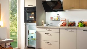 hochgebauter Backofen, vollintegrierter Kühlschrank und eine kopffreie Dunsthaube