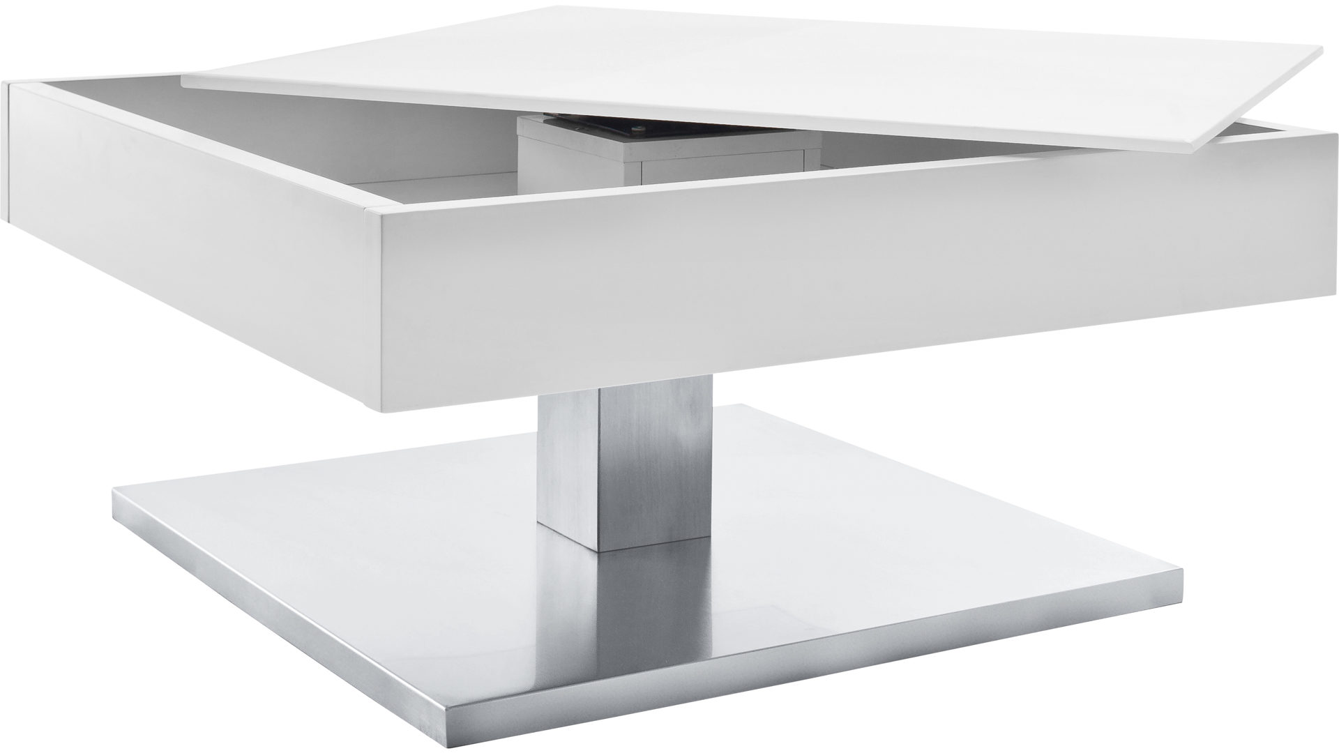 Der Couchtisch Mariko beeindruckt mit seinem außergewöhnlichen Design, das besonders extravagant erscheint und in jedem Wohnzimmer zu einem absoluten Eyecatcher wird. Als robuste Basis fungiert ein klassisch-edelstahlfarbener und gebürsteter Sockel auf einem drehbaren mattweißen Glasboden, den Sie bis maximal 20 kg belasten können. Die mattweiß lackierte Tischplatte rundet die spannende Optik des Couchtisches schlicht und harmonisch ab.